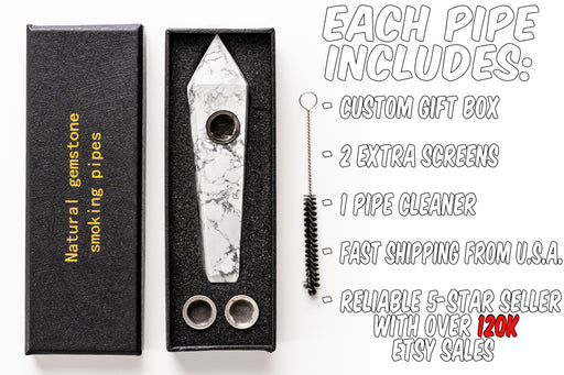 Discover our unique collection of gemstone and quartz smoking pipes, each carefully crafted to combine beauty and functionality. These 5-inch pipes are designed from high-quality stone and feature a built-in mesh screen to enhance the smoothness and enjoyment of every session, and come in a beautiful custom gift box. Whether you're an enthusiast of natural stone aesthetics or looking for a refined tool for your favorite herbal blends, our pipes offer a stylish and reliable choice. Ideal for collectors, connoisseurs, and anyone who values a touch of nature in their smoking experience.