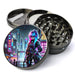 Cyberpunk anime-style Herb Grinder featuring a futuristic, neon-lit cityscape., Extra Large 5 Piece Spice Tobacco Herb Grinder